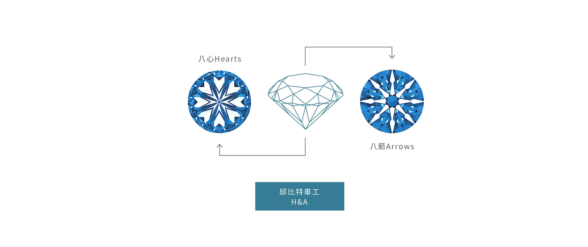 邱比特車工,俗稱「八心八箭」(HEARTS & ARROWS,簡稱H&A),是一種在鑽石上發生的視覺現象,當明亮式圓形鑽石切工的對稱性好,透過鑽石觀賞鏡從鑽石的正上方俯視鑽面,呈現出對稱排成一圈的八箭圖形;從尖底正下方觀看,呈現對稱排成一圈的八個心形。因為有心和箭,象徵邱比特的愛情之箭,因此被取名為邱比特車工。 頂級邱比特= 完美比例+完美對稱+完美拋光,是每個心、箭的大小、形狀要一致、方向要對稱、呈完美平衡,多結合理想式切工(Ideal Cut)與上八心八箭。 |