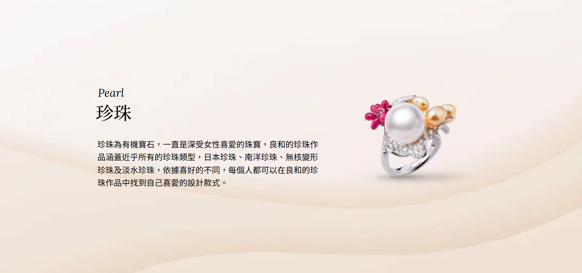 珍珠是唯一不需要加工的珠寶,因此它的美是與生俱來的,它雖然不及其他寶石堅硬,但其特有的光澤是所有寶石無法比擬的清新脫俗,其從內部散發出來的光暈,又被稱為「虹彩」,被認為是珍珠的靈魂。 而鑽石與珍珠經典的搭配,是日常的必備單品,良和從戒指、項鍊到耳環,皆可以找到您專屬的設計珠寶。良和也擅長運用藝術家的想像力,將平凡無奇的變形珍珠,打造獨一無二的有趣珠寶,增添珠寶價值的無限可能。 |
