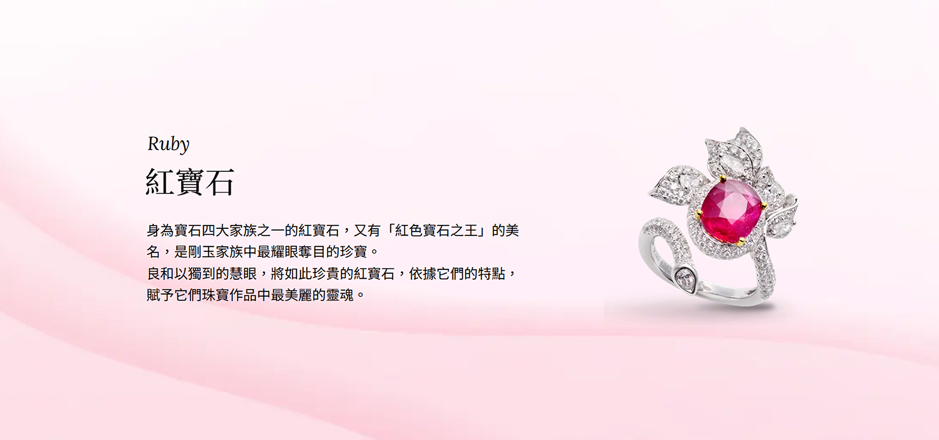 歷史中的紅寶石常出現於皇冠與權杖中等象徵富貴及地位的物品上,是自古以來皇室等權貴人士十分珍愛的寶石。 良和依據紅寶石的特點,演繹如花卉般美麗的紅寶石作品;以頂尖工藝打造360°設計的紅寶石手鍊;還有以兩顆紅寶石愛心相遇的故事所打造的系列珠寶,皆是作為禮物和收藏的不二之選。 |