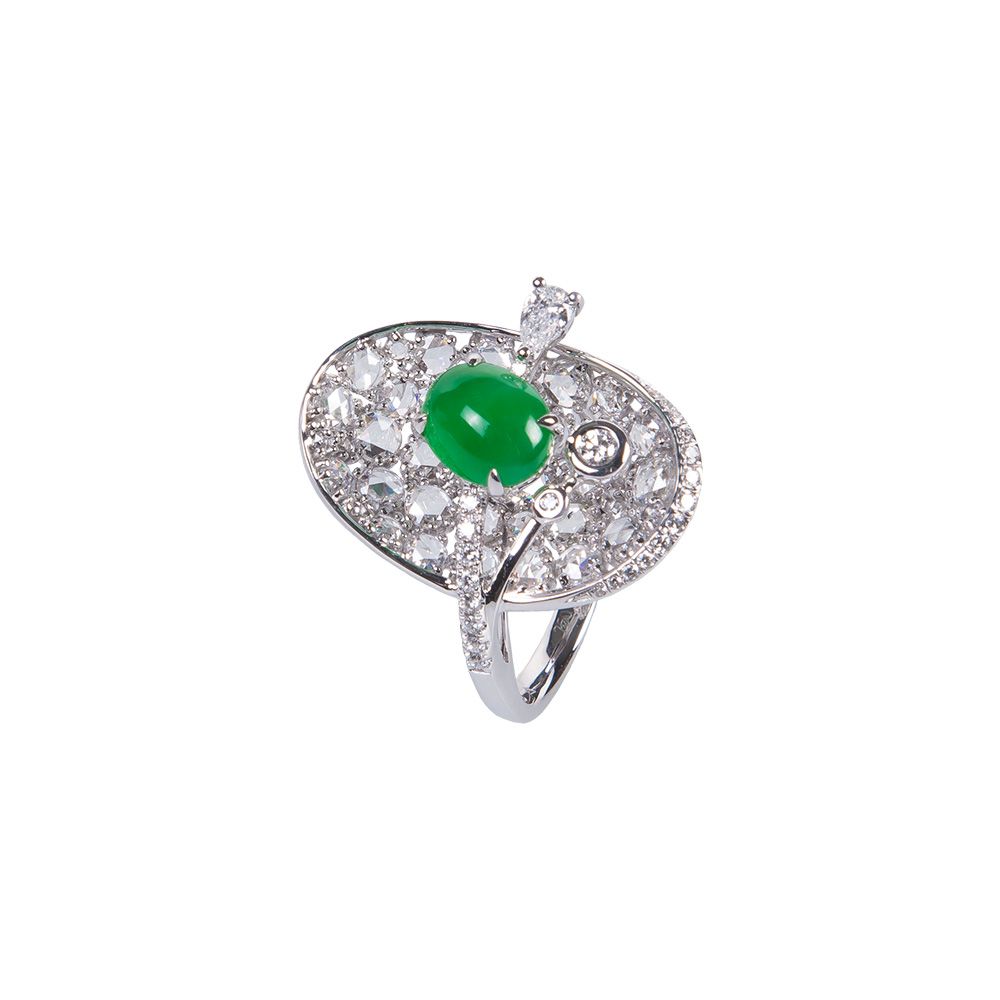 18K白金、天然翡翠1顆、梨型鑽1顆0.15克拉、玫瑰車工鑽石41顆2.32克拉、鑽石24顆0.22克拉