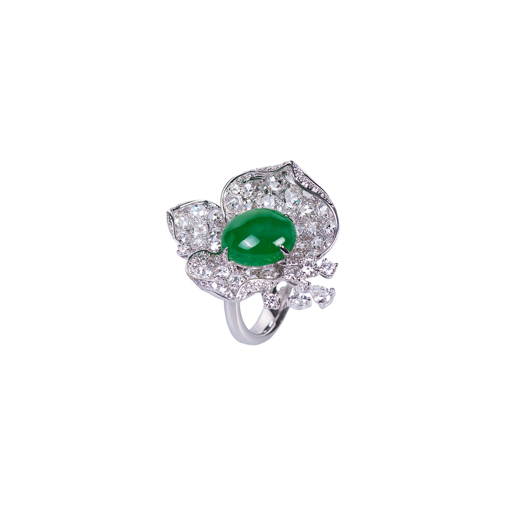 18K多色K金、天然翡翠1顆、梨型鑽2顆0.18克拉、玫瑰車工鑽石62顆 2.33克拉、鑽石44顆0.46克拉