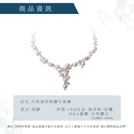 18白K金、南洋珠27顆、鑽石原石8顆5.35克拉、彩鑽315顆8.33克拉、H&A圓鑽10顆1.23克拉、鑽石553顆5.64克拉