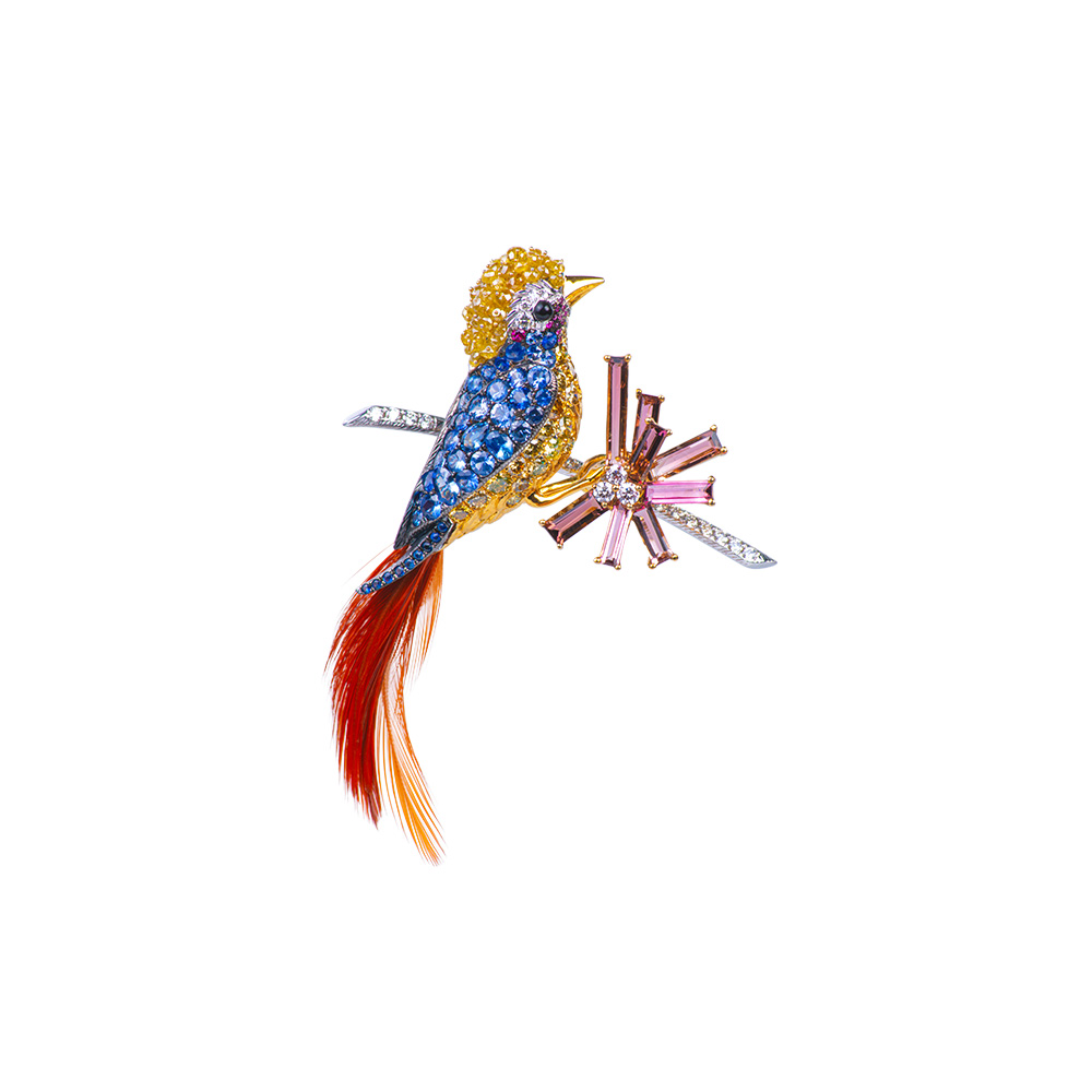 18K多色K金、藍寶43顆3.75克拉、黃鑽19顆1.84克拉、碧璽8顆3.8克拉、黃鑽56顆3.09克拉、紅寶12顆0.14克拉、鑽石28顆0.78克拉、黑瑪瑙羽毛