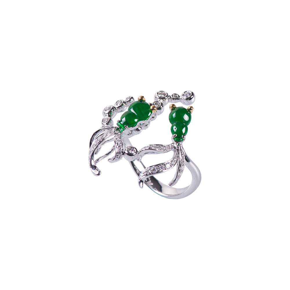 18K白金、天然翡翠2顆、鑽石46顆 0.36克拉