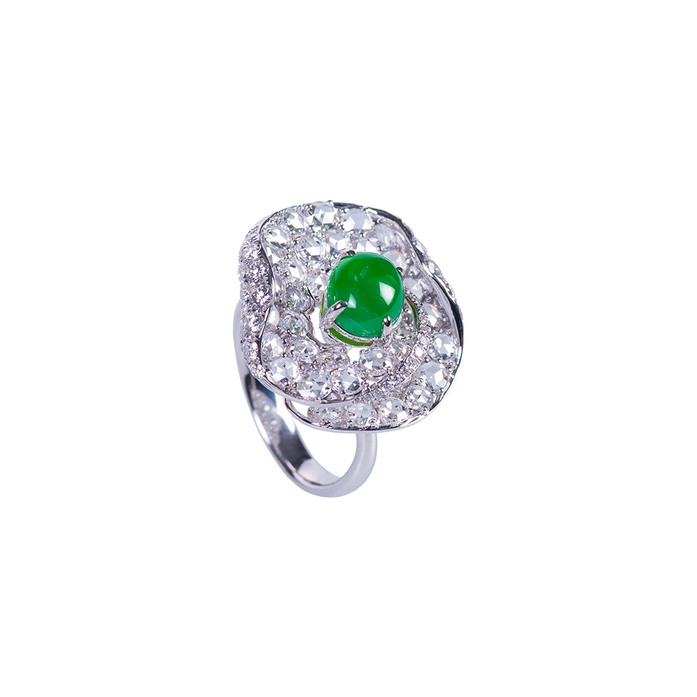 18K白金、天然翡翠1顆、玫瑰車工鑽石 40顆 1.80克拉、鑽石46顆 0.79克拉限量作品僅只一件。