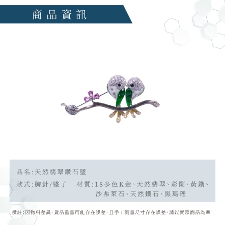 18多色K金、天然翡翠2顆、彩剛3顆0.62克拉、黃鑽11顆0.04克拉、沙弗萊石17顆0.13克拉、小鑽124顆1.66克拉、黑瑪瑙