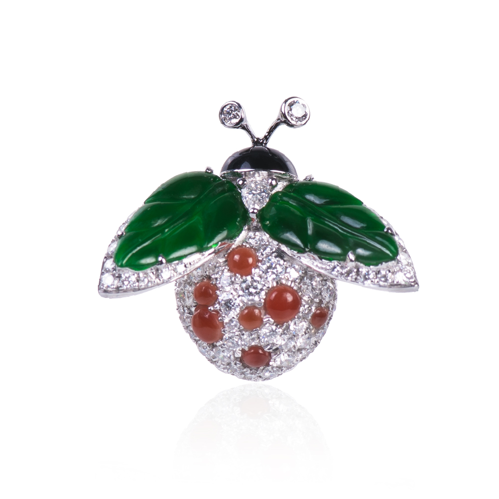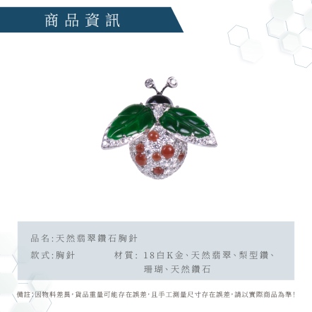 18白K金、天然翡翠2顆、梨型鑽1顆0.08克拉、珊瑚、7顆0.35克拉、鑽石65顆1.17克拉