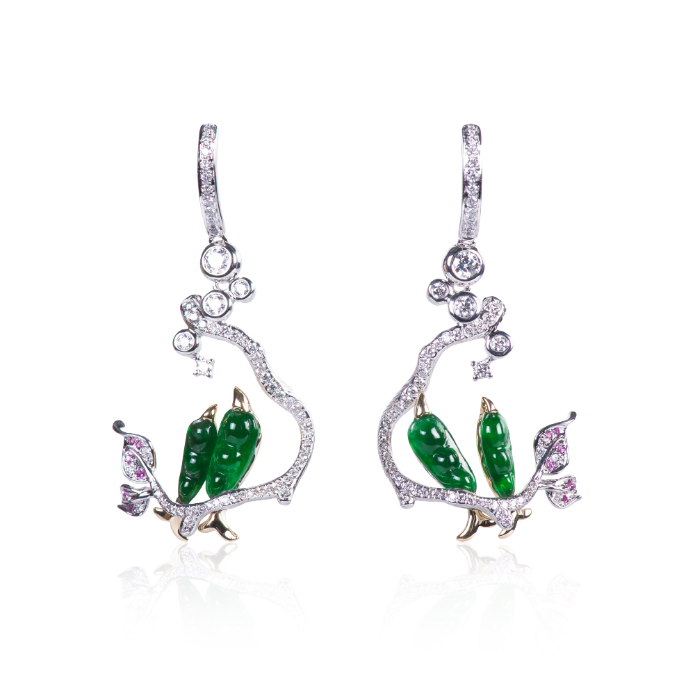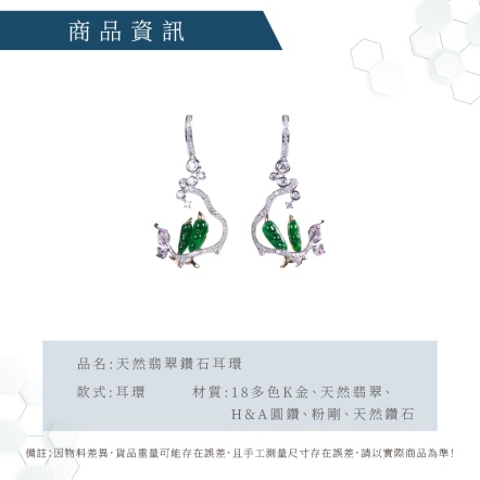 18多色K金、天然翡翠4顆、H&A圓鑽2顆0.18克拉、粉剛14顆0.05克拉、鑽石126顆0.82克拉