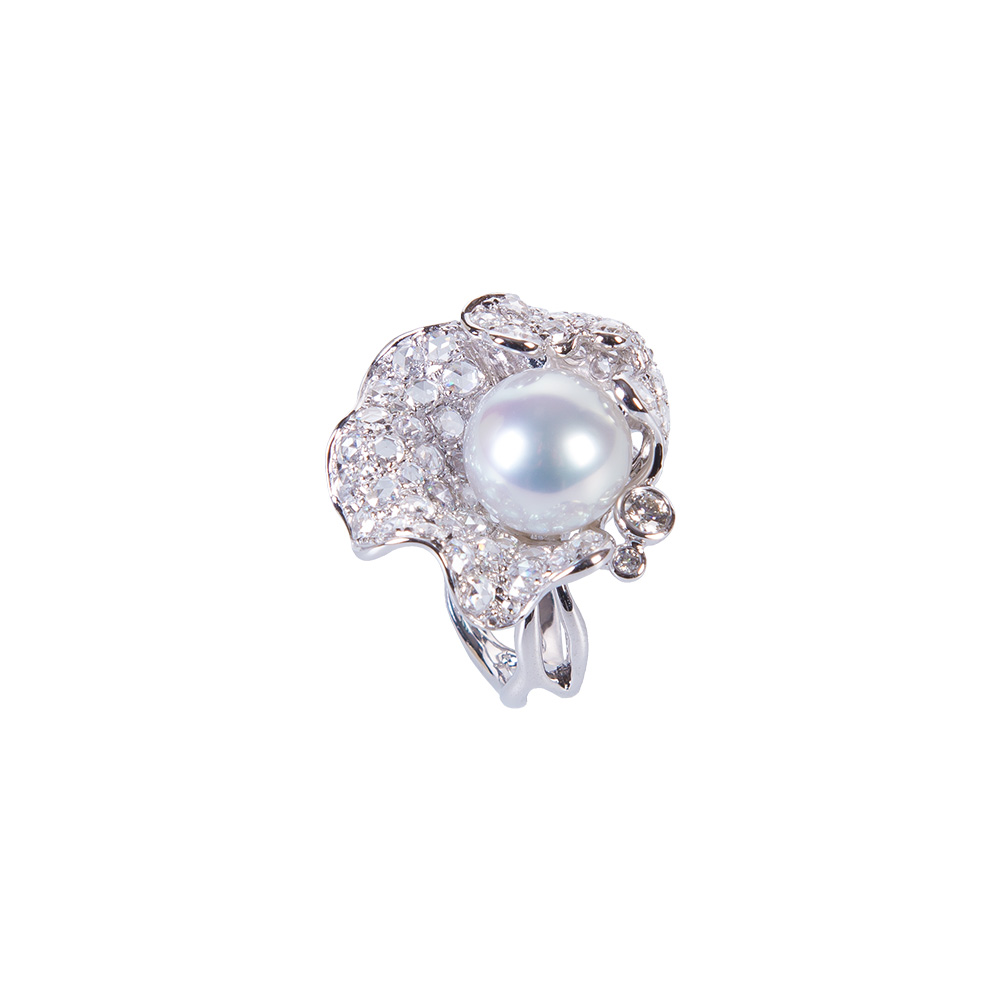 18K白金、天然南洋珠1顆、玫瑰車工鑽石71顆 1.92克拉、鑽石2顆 0.11克拉
