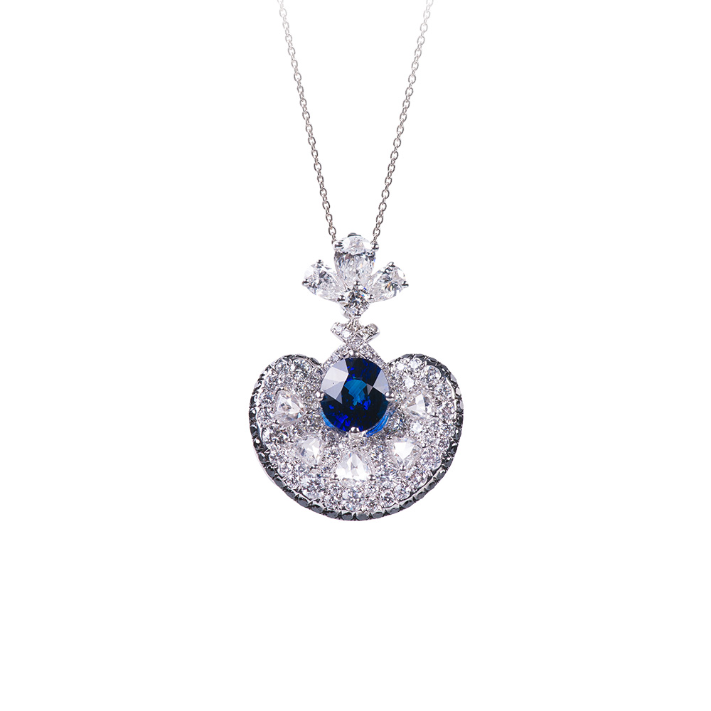18K白金、藍寶石1顆1.32克拉、玫瑰梨鑽5顆0.43克拉、梨型鑽3顆0.49克拉、黑鑽石37顆0.26克拉、鑽石63顆0.79克拉