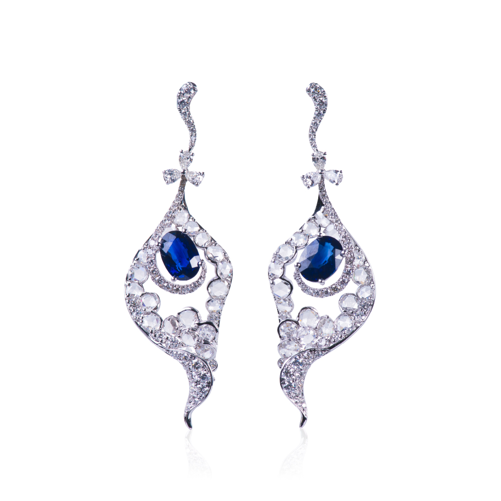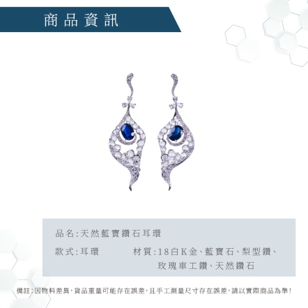 18白K金、藍寶石2顆 2.4克拉、梨型鑽6顆 0.33克拉、玫瑰車工鑽48顆 2.95克拉、鑽石92顆 1.07克拉