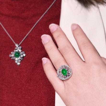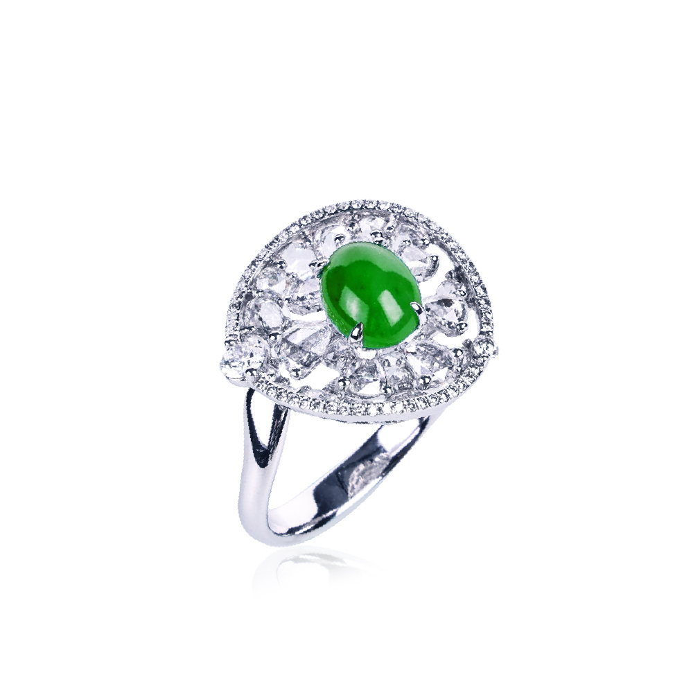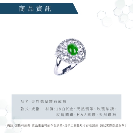 18白K金、天然翡翠1顆、H&A圓鑽1顆 0.1克拉、玫瑰梨鑽7顆0.56克拉、玫瑰圓鑽 28顆1.13克拉、鑽石 53顆 0.15克拉