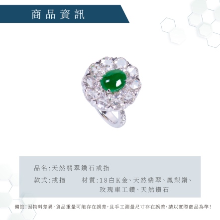 18白K金、天然翡翠1顆、玫瑰車工鑽10顆2.71克拉、鳳梨鑽14顆1.28克拉、鑽石8顆 0.16克拉