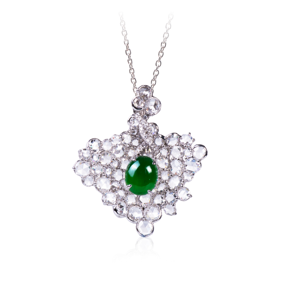 18白K金、天然翡翠1顆、玫瑰車工圓鑽 65顆 4.31克拉、鑽石22顆 0.07克拉