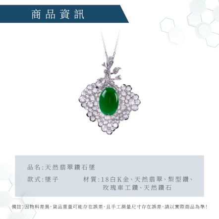 18白K金、天然翡翠1顆、梨型鑽4顆 0.46克拉、玫瑰車工鑽60顆 7.06克拉、鑽石52顆 0.35克拉