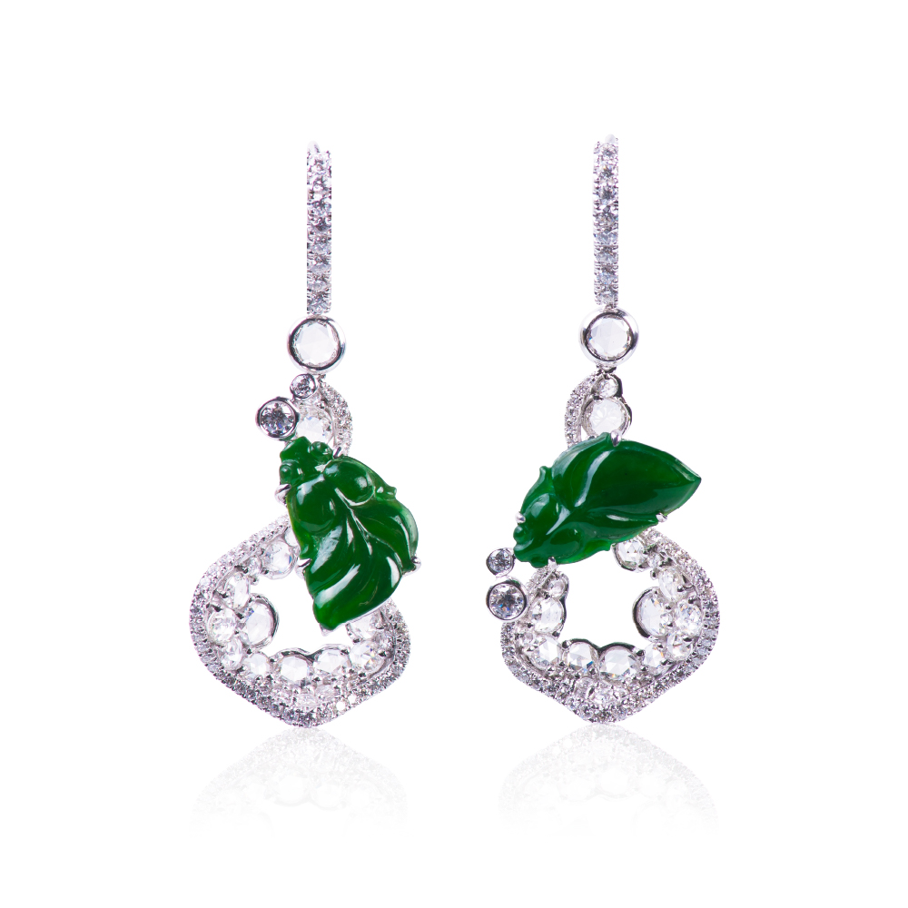 18白K金、天然翡翠2顆、玫瑰車工鑽 2顆 0.24克拉、玫瑰車工鑽 48顆 1.94克拉、鑽石132顆 1.04克拉