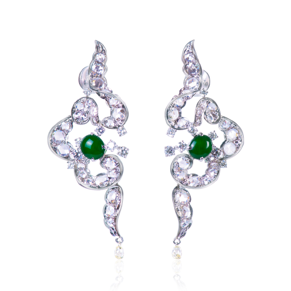 18白K金、天然翡翠2顆、黃鑽2顆0.35克拉、玫瑰車工圓鑽 52顆2.81克拉、鑽石18顆 0.66克拉