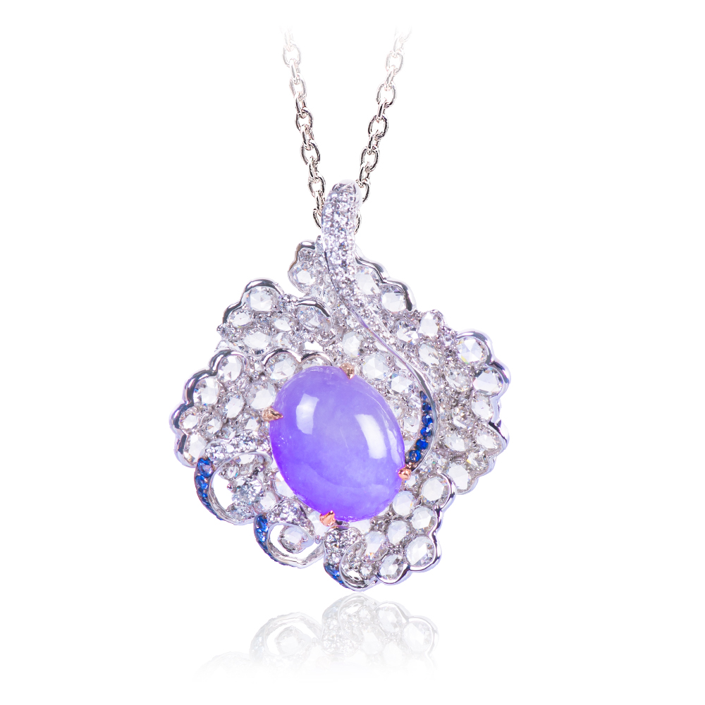 18白K金、天然紫翡1顆、H&A圓鑽1顆 0.11克拉、玫瑰車工鑽 106顆 5.36克拉、藍寶石26顆 0.28克拉、
