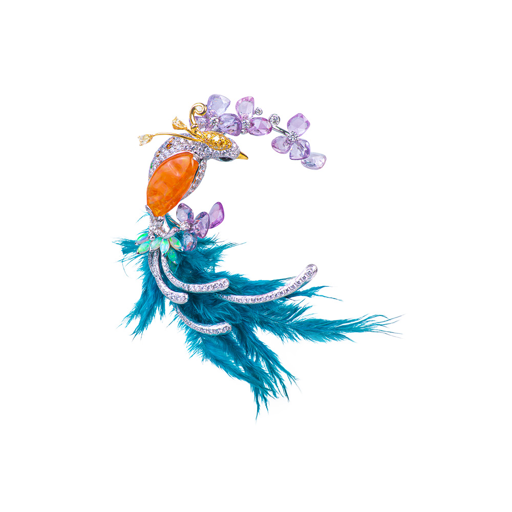 18K多色K金、蛋白石1顆9.49克拉、蛋白石7顆 0.75克拉、彩剛14顆 14.9ct、藍寶27顆 0.71克拉、沙弗萊石9顆 0.22克拉、黃鑽3顆 0.35克拉、黃鑽27顆 0.37克拉、H&A圓鑽1顆 0.08克拉、鑽石157顆 2.5克拉、黑瑪瑙
