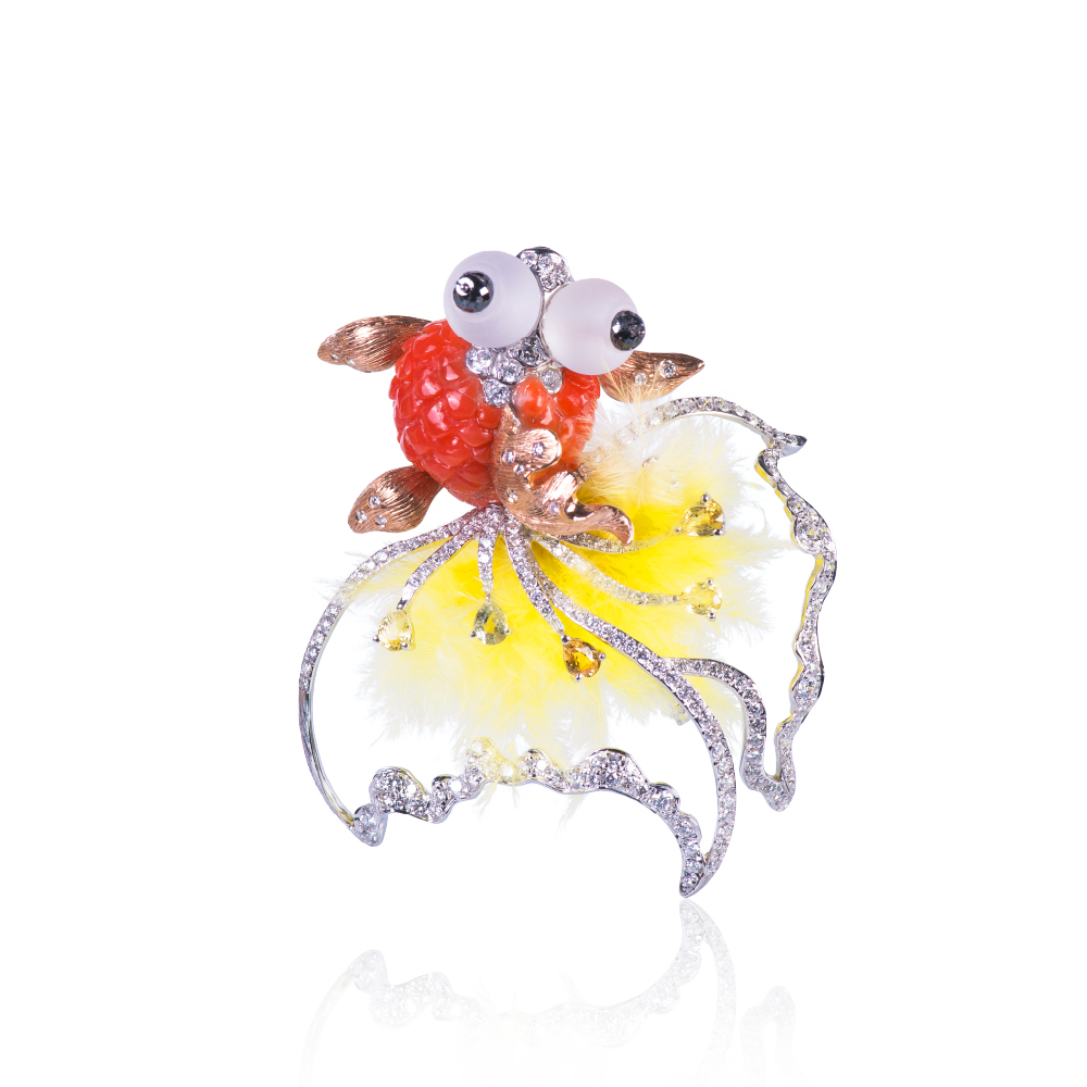18多色K金、珊瑚1顆4.64克拉、黑鑽2顆0.71克拉、彩剛6顆1.26克拉、鑽石192顆 2.15克拉、白水晶羽毛